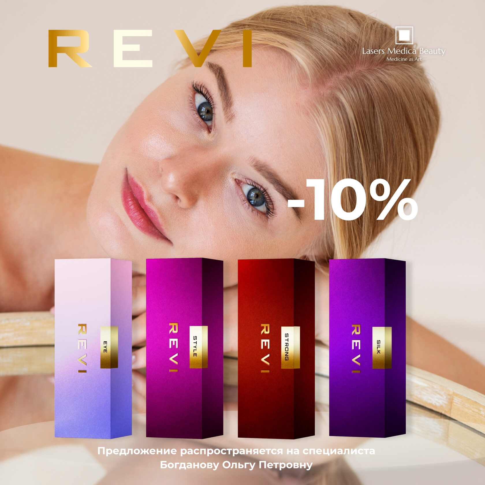 В линейке представлены 4 вида препаратов: Revi Eye — для области вокруг глаз Revi Style — для пациентов с первыми признаками старения Revi Silk — для чувствительной кожи Revi Strong — для кожи 35+