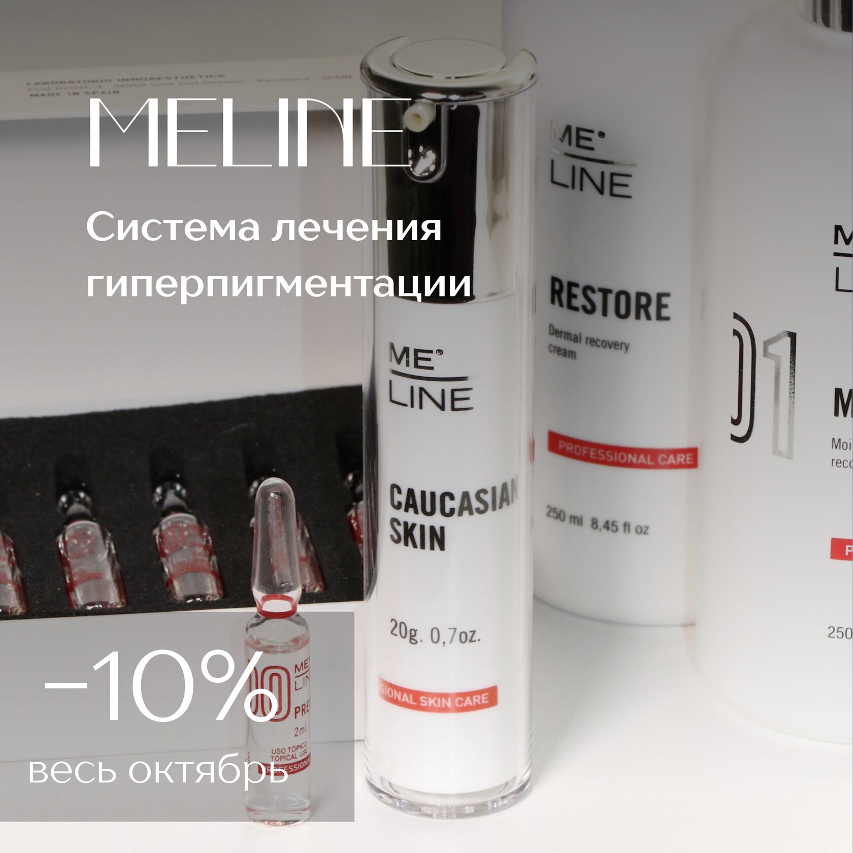 MELINE — это синергия профессиональных средств и домашней терапиидля комплексного лечения гиперпигментации. Подход включает проведение пилингов у косметолога с соответствующими постпроцедурными средствами.